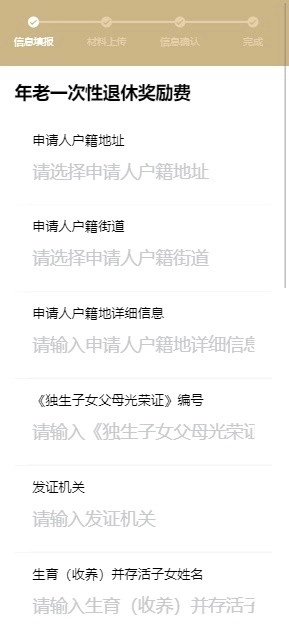 当用户选择申办“年老退休一次性计划生育奖励费”这一子事项时,系统会呈现“一次性计划生育奖励费”的相关填报信息录入界面。