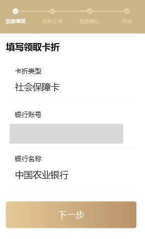 4.填写申领人账户信息,默认为第三代社会保障卡;未获取社会保障卡信息的,可选择其他银行的申领人本人实名制账号,银行账户类型须为一类结算账户。银行账号信息填写完成后,系统会对银行账号进行实时校验。