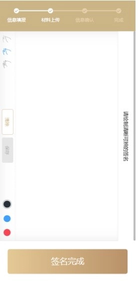 3. 完成证照上传后,点击“下一步”进入电子签章环节。电子签章支持暂存功能,下次进入系统时将自动显示之前暂存的签名。