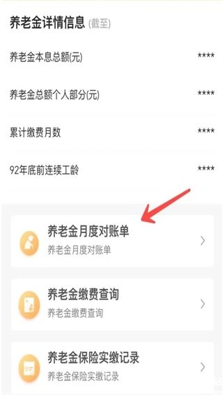 3、比如查询养老金,可以看到相关信息,以及月度对账单、缴费查询等记录;