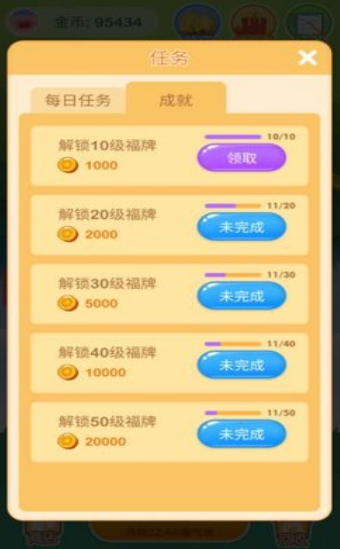 欢乐摇钱树福利版这个游戏一上线就给玩家送福牌,福牌的等级越高,玩家能拿到的奖励也就越多,赶紧升级自己的福牌去领更多奖励吧。每天签到能拿金币,玩家每天只要简简单单登录一下游戏,就能领到不少的金币奖励。达成成就有奖励,把福牌升到成就要求的等级就能解锁成就,解锁成就能得到大量金币。