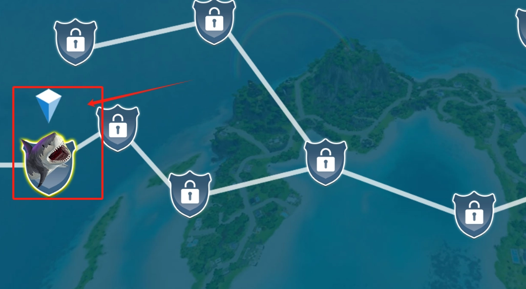 2、当看到地图上有带锁盾牌和蓝色宝石时,点击被红框圈起来的鲨鱼图案,就可以开启探险任务啦。