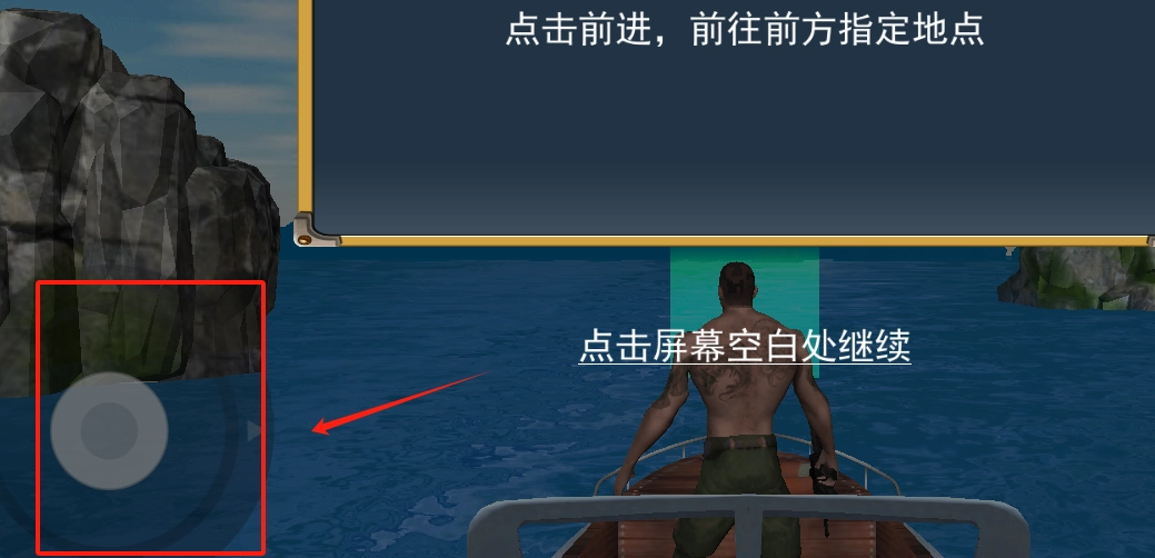 3、看到男子坐在船上,同时屏幕有提示,点击空白处可继续游戏,接着点击下方圆形按钮就能向前行进啦。