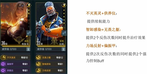 4、反伤队:布狄卡+比利。以独特比例反伤的攻击模式,对装备依赖度低,完全不用考虑自身的火力属性。装备反伤型技能,搭配防御模式的玄武泰坦,阵容组建难度低,适合氪度不高的玩家开荒使用,团战时基本用来抗线挨揍吸引火力。