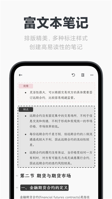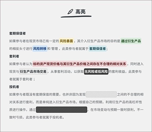 外框可框选部分段落设置外框并编辑外框标题,提供七种不同颜色外框供选择,高亮支持七种不同高亮颜色标记笔记重点和两种挖空颜色隐藏挖空内容,折叠展开可对标题、列表段落点击段落前面的进行折叠或展开,还有备注、注解、大纲等功能。