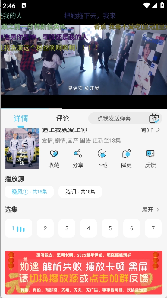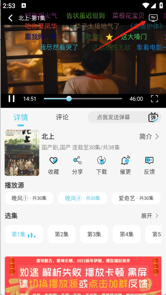 4、找到并点开想看的影片后,就能开始播放影视内容了,还可以观看弹幕、切换播放源。