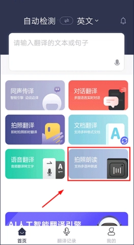 使用起来十分简便,进入首页后,您会看到各类翻译功能,点击【拍照朗读】,接着完成拍照操作就可以了。
