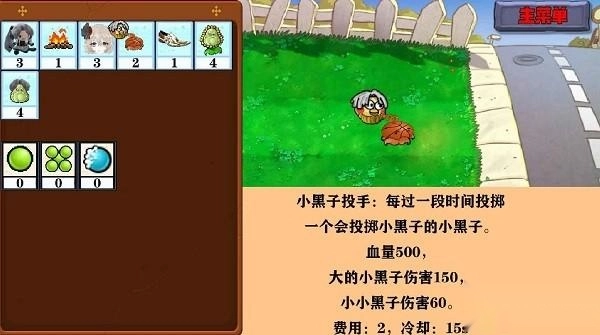只因未来发射篮球命中造成最大生命值10%伤害并造成小范围爆炸固定伤害10,血量300、费用3、冷却60s;篝火生产经验球第一次40后续25,给附近挨着的植物回血一次50点、点卡片选取时能看到治疗范围,血量50、费用1、冷却12s;小黑子投手每过一段时间投掷一个会投掷小黑子的小黑子,血量200、大的小黑子伤害150、小小黑子伤害50,费用2、冷却15s。