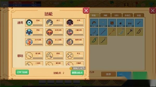 3、点击角色属性下方的技能可以学习不同的招式,每次学习会消耗一点技能点和不同数量的金币。