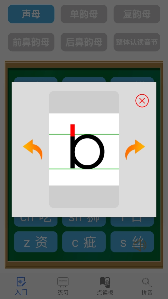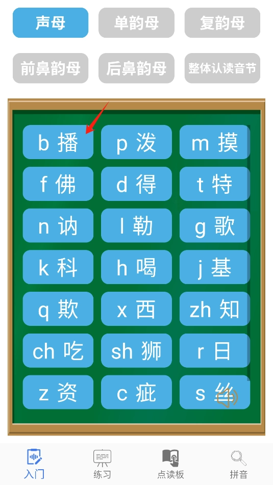 打开后,在主界面点击声母、单韵母等选项,再点击下方的字母就能学习拼音了。