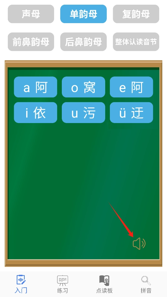 点击下方的按钮,可以对上方的韵母进行语音朗读。