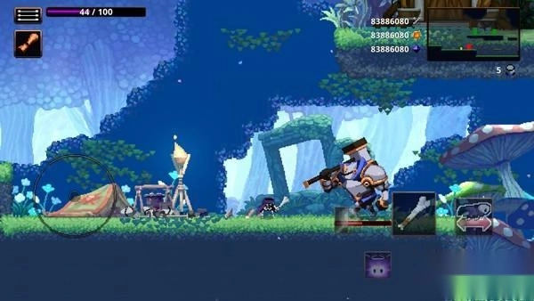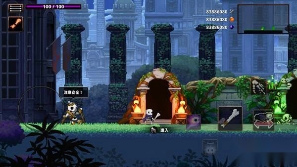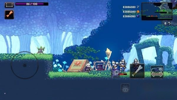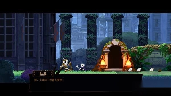 采用细腻的手绘像素风格,角色动画十分流畅——小骨奔跑、头骨切换以及BOSS技能都配备了多帧动画;场景层次清晰,从魔王城废墟逐步过渡到人类圣地。特效华丽却不显杂乱,像死神镰刀的全屏斩击、冰河小骨的冻结领域,都具有极高的视觉辨识度。