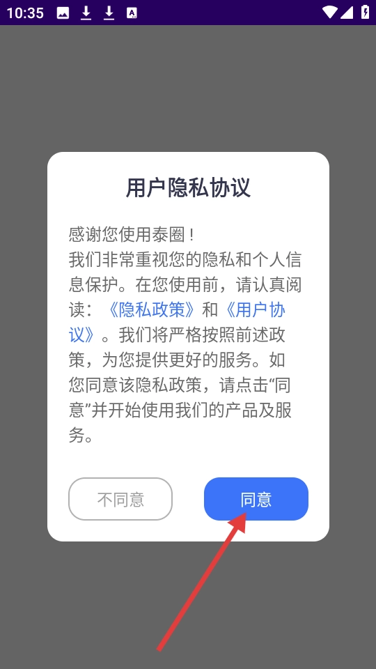 1、打开泰圈应用后,先点击【同意】用户隐私协议,随后即可进入应用主界面。