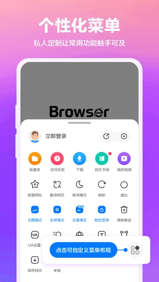 【个性定制】主页、壁纸、工具栏均可自由设置,无痕浏览、夜间模式等功能一应俱全,助你打造专属于自己的浏览器体验。