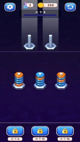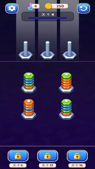 刚进入关卡时,首先要清点清楚当前需要整理的螺母有多少数量、涉及哪些颜色种类,同时明确好目标排序的方向,这样能避免因盲目操作而浪费时间。