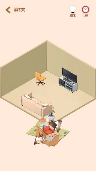 玩家需要点击纸箱来获取家具,在规定时间内完成摆放;要是遇到困难,点击提示按钮就能获得提示。