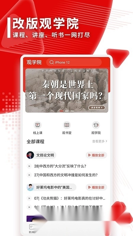 观学院板块已完成全面升级,现已整合要闻、课程、讲座及听书等各类资源。