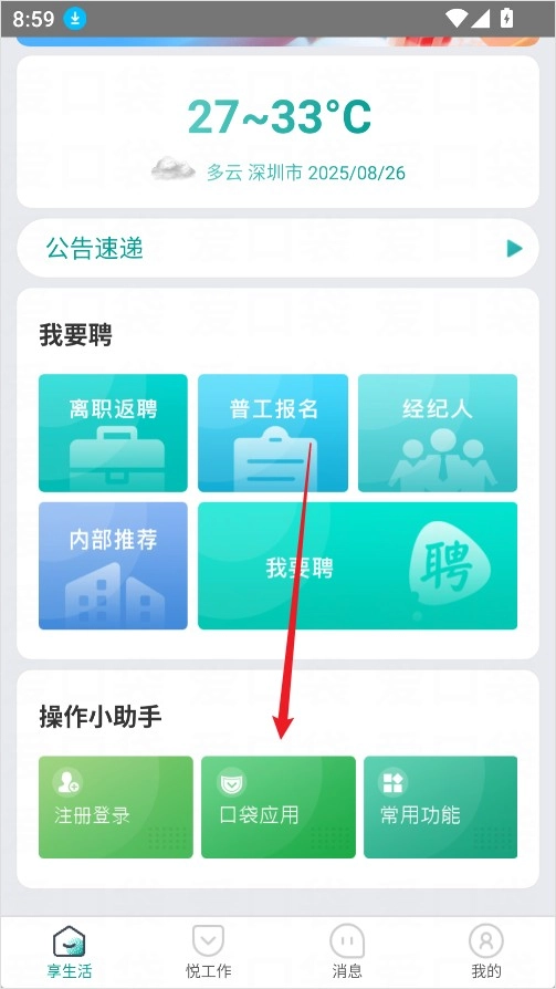 1、用户打开爱口袋App并登录进入首页,首页设有操作小助手,点击其中的口袋应用即可。
