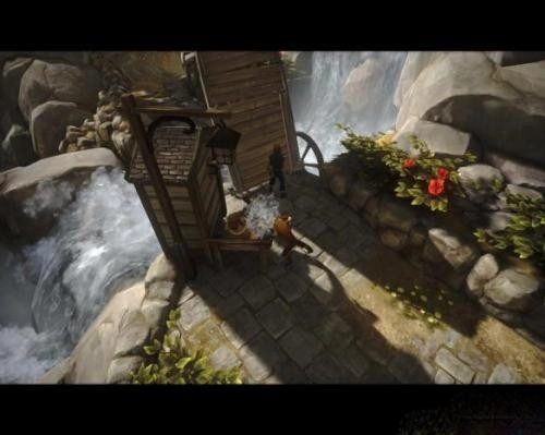 4、兄弟俩一路往下走,一同推开一扇门后,来到了一个看似储存粮食的地方(途中有几口井,弟弟要是和井互动,会往里面吐痰)。这里有一条狗不停地冲他们狂吠,这时得让兄弟俩交替配合:先由弟弟吸引狗的注意力,哥哥趁机跑到“鼓”上;接着换哥哥吸引狗的注意,好让弟弟通过,如此反复才能过了这处。之后继续往前走,穿过障碍便到了一家农舍前,眼前需要过一座小桥。先让弟弟在桥边的开关处不停跑动,哥哥则去对岸抱回一只羊,再把羊放上去,让羊代替弟弟跑动,这样两人就能顺利过桥了。