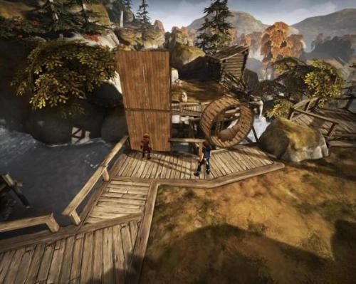 5、穿过农舍后,从之前路过的粮仓上方经过,会遇到一个正在哭泣的巨人。剧情结束后,跟随巨人前进——它会帮兄弟俩越过途中的诸多障碍。踩着巨人的肩膀渡过河流,爬到对岸的枯藤上,等巨人从下方爬上来后,再从它的肩膀上爬过去;巨人会把兄弟俩抛到对面,之后爬到一个平台上,等巨人张开双手时与它互动,巨人便会带着兄弟二人跳下瀑布。