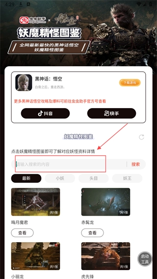 黑神话悟空的妖魔精怪图鉴具备智能搜索功能,用户只需输入妖精名称的关键词,就能快速查询到该妖精的相关信息。