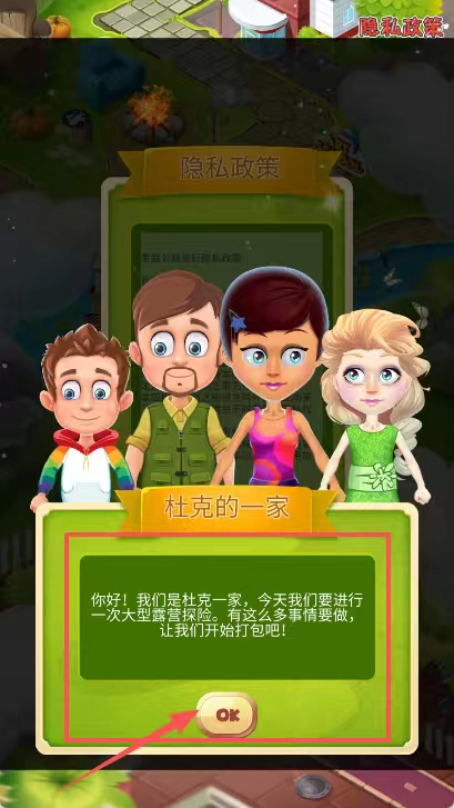 打开游戏后,杜克一家四口邀请去露营探险,绿色对话框提示该打包了,直接点击ok按钮即可开启露营准备。
