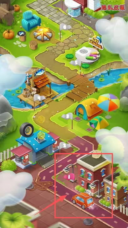 在卡通风格的城镇场景里,砖红色的两层小楼被红框圈出,楼前停放着一辆橙色的小汽车;画面左上角能看到一家带有轮子的蓝色店铺,右上角的休闲区域则摆放着露营帐篷之类的设施。