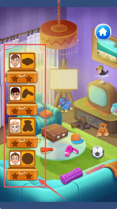 室内场景的左侧摆放着四个带有头像和星星图案的行李箱图标,右侧则是一间紫色墙面的房间,墙上挂着画作、电视机等物品,这些丰富的布置一目了然。