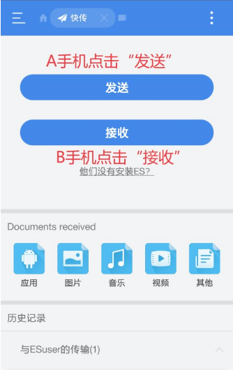 两台手机都打开ES文件浏览器,在主界面点击进入“快传”功能。