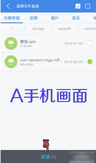 A手机点击“发送”按钮,进入选择文件的界面,可多选。