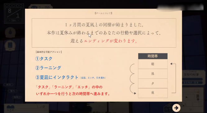 3、其次要关注游戏时间,就像标题说的一样“30天”,所以我们主要任务就是在30天内,尽可能提升主角数值和姐姐的好感度