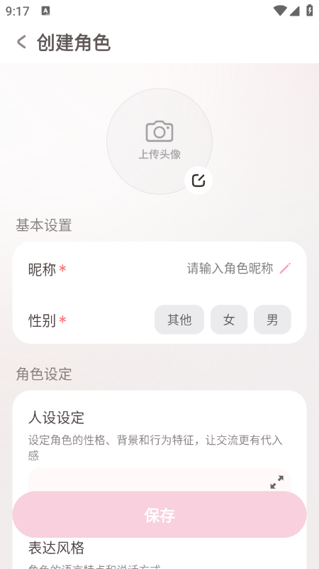 上传角色头像,设置角色昵称、性别,填写人设设定及语言特点,完成后点击保存;