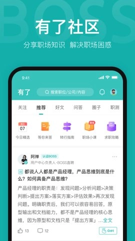 此外BOSS直聘还设有职业百科板块,助力用户更高效地与未来上级直接沟通,实现当场敲定意向、快速入职。