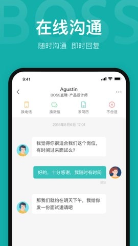 BOSS直聘让跳槽变得更简单,用户能随时随地和Boss约聊,未来的上级还会直接在线面试。