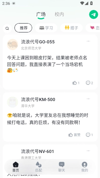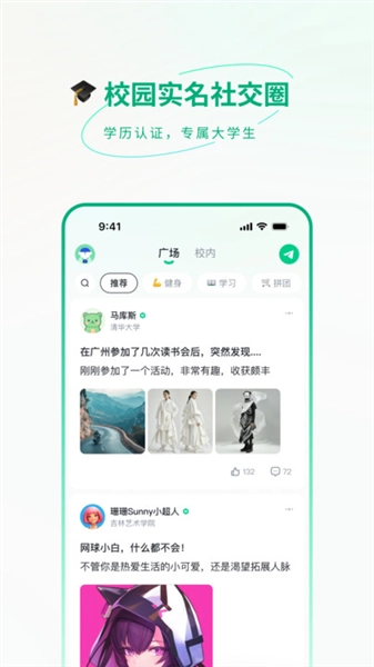 首页设有动态广场和校内动态板块,用户可以浏览其他校友发布的动态内容。