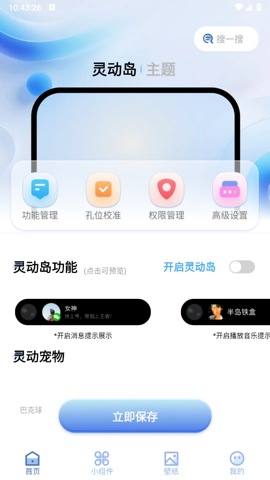 主页设有灵动岛与主题两大板块,用户可根据自身需求直接选用。