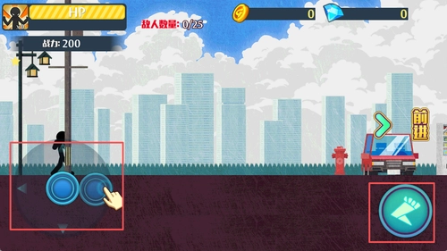 2、左侧虚拟摇杆控制移动,右侧按键分别对应攻击、跳跃与武器切换操作。