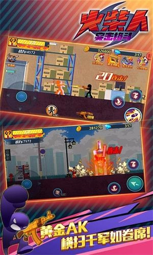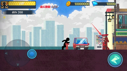 《火柴人突击格斗》是一款横版动作格斗游戏,玩家操控火柴人通过左侧虚拟摇杆移动、右侧按键实现攻击/跳跃/武器切换,在冒险、酷跑等4种模式中,需击败普通小兵、装甲单位、飞行敌等逐步复杂的敌人(如生存模式需坚持特定时间、部分关卡需解救人质),通关后获取金币解锁新角色、武器(含冷热兵器,如近战刀具、远程枪械)与皮肤,角色升级可解锁被动属性加成(如生命值提升),其连招顺滑(支持浮空连打等高阶操作)、血溅特效带劲,动画帧数充足,关卡难度稳步上升,让新手到高手都能获得成长感,整体耐玩度较高,适合动作格斗爱好者长期体验。