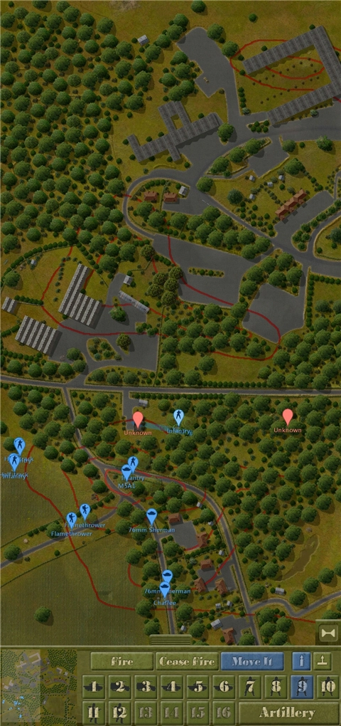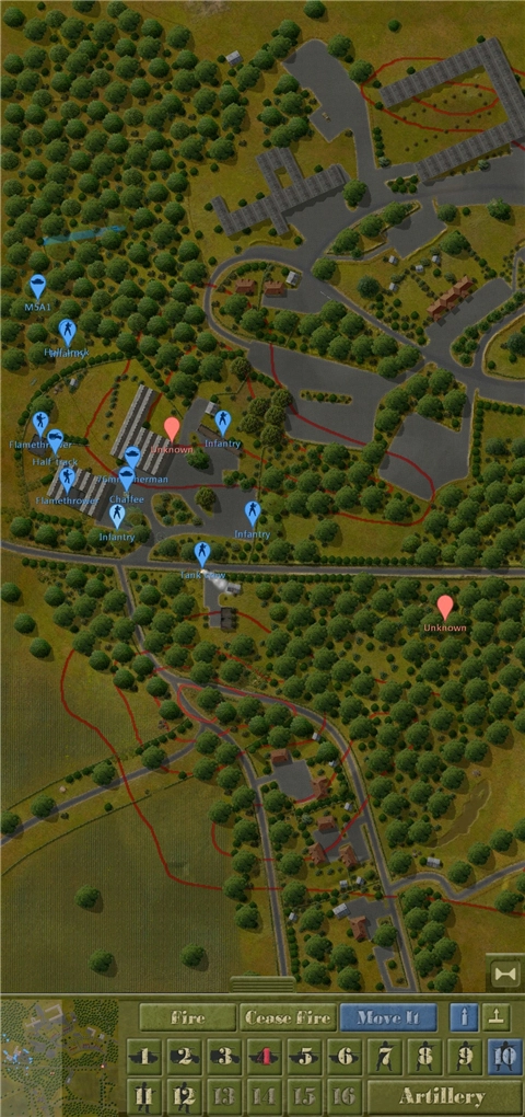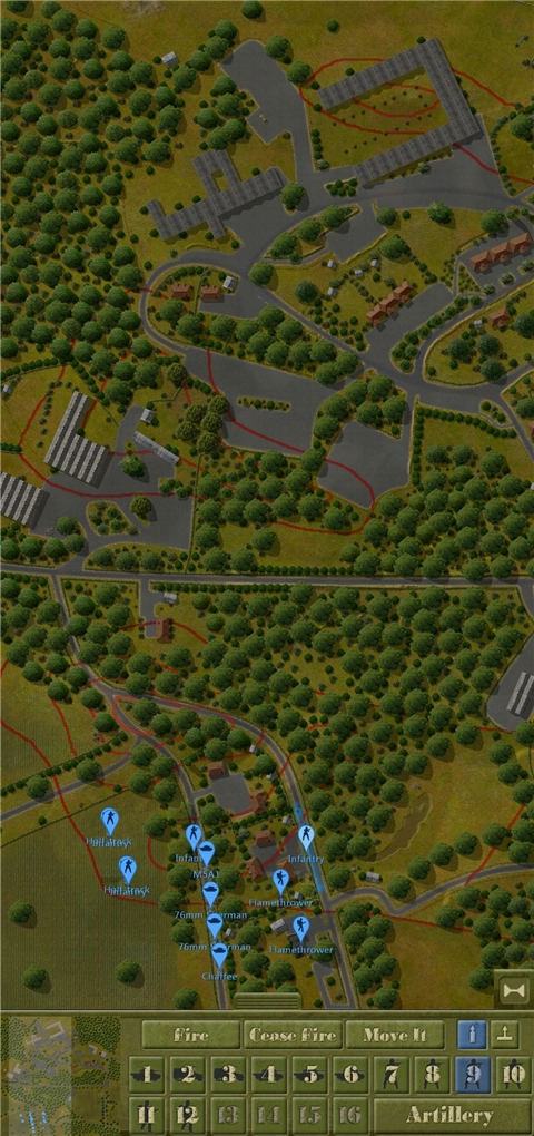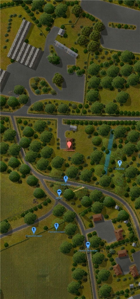 3、从图中可以看出,当前局势十分危急。我方回撤的部队已被发现,但因身处复杂的丛林环境,尚未遭到交叉火力的压制。我决定命令他们强行发起进攻,并调派M5A1予以支援;同时,安排地图最左端的机械步兵实施迂回穿插。由于机械步兵团的位置被遮蔽物环绕,无需担心会受到火力打击。