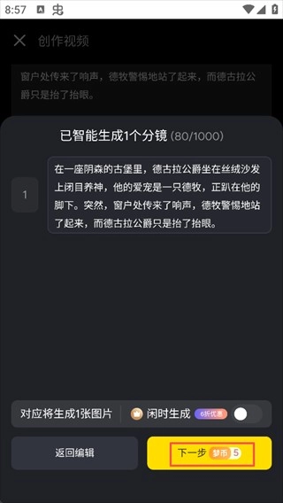 3、系统自动拆解分镜后,消耗梦币点击“下一步”进入后续流程。