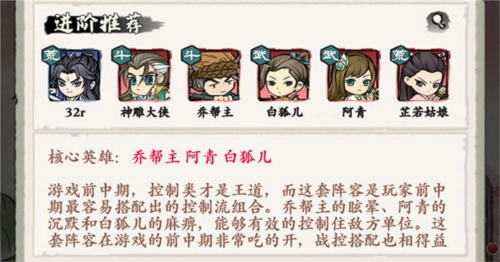 核心英雄:乔帮主、阿青、白狐儿。在游戏前中期,控制类英雄才是关键,这套阵容是玩家在前中期最容易凑齐的控制流组合。乔帮主的眩晕、阿青的沉默和白狐儿的麻痹,能有效限制敌方单位。这套阵容在前中期表现出色,战斗与控制的搭配也十分协调。在中期卡牌不足的情况下,无疑是优先选择的阵容。