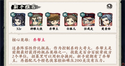 核心英雄:乔帮主。这套阵容性价比极高,作为控制系的大哥大,乔帮主是前期最好获得的极品英雄之一,技能是百分百眩晕敌方2个单位,招募里可以用积分换到。新手前期有了乔帮主,再搭配几个橙色侠客轻松碾压200关没有压力。