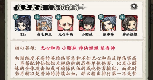 核心英雄组合为无心和尚、小昭妹、神仙姐姐与楚香帅。在初期练度较低时,其他英雄的伤害总和甚至比不上无心和尚的反弹伤害;搭配神仙姐姐无视防御的强力单体输出,再加上小昭妹提供的全体攻击加成,队伍便能稳定打出高额伤害;若此时还有楚香帅的持续回血辅助,拿下输出排行榜第一并非难事。