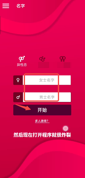 1、启动手机上的couplegame应用,首先设定玩家的性取向,随后输入情侣双方的昵称。