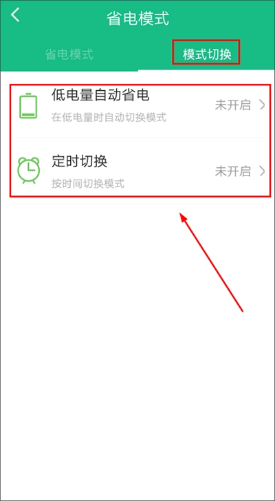 点击【模式切换】,这里设有自动设置功能:用户可自行设定低电量时自动开启省电模式,也能设置定时开启省电模式,通过这样的方式,能让用户更便捷地实现手机的长时间使用。