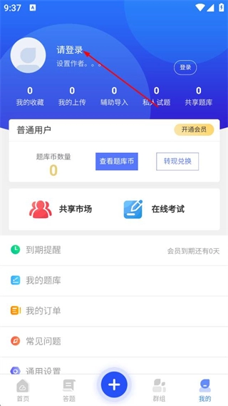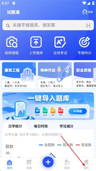 在试题通的首页,点击底部导航栏中的“我的”选项,就能进入到个人中心页面。