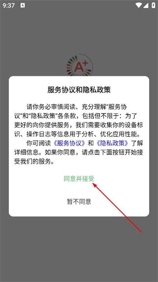 在仔细阅读服务协议与隐私政策的内容后,点击“同意并接受”按钮,即可进入平台首页。