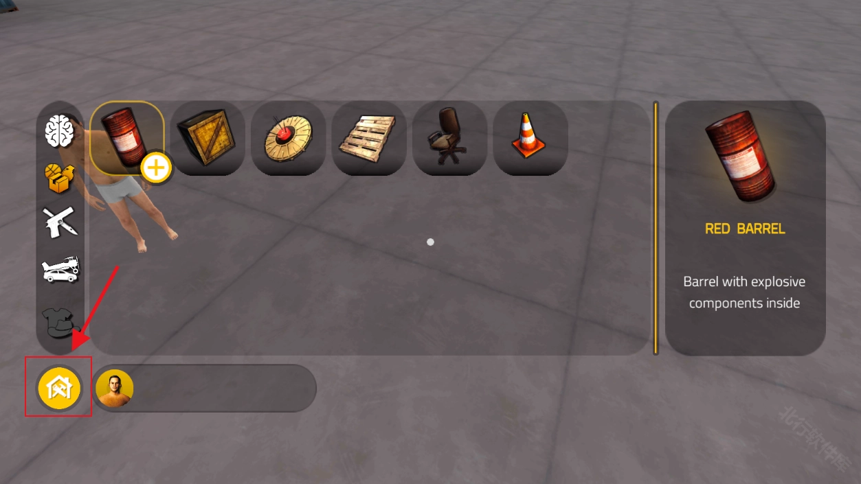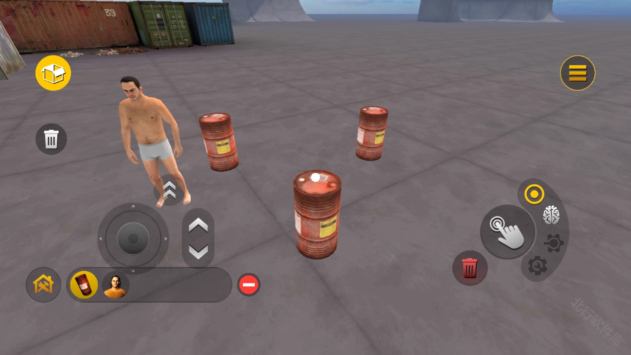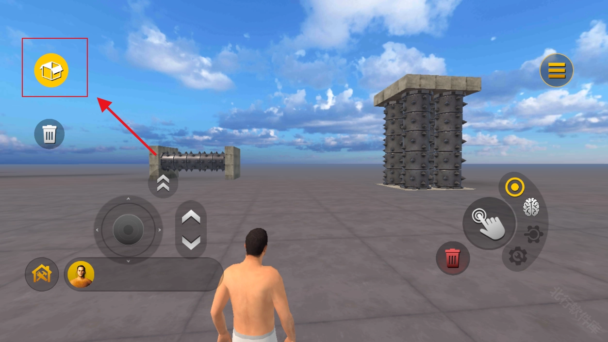 5、在道具栏里选中你想放置的物品,点击右侧的【手指】按钮,就能把它放到沙盒里。把准心对准要移除的道具,点击【垃圾桶】图标就能将其删除。玩家只要灵活运用添加和删除功能,就能打造出属于自己的沙盒世界了。