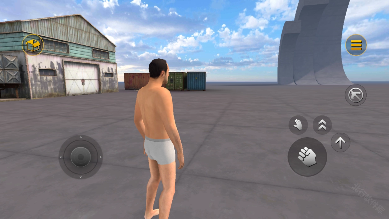 2、玩家能够操控沙盒创造者,通过滑动左侧摇杆来控制角色移动,右侧的功能按钮分别对应出拳、互动、飞行与加速,点击手枪图标即可使用激光眼。