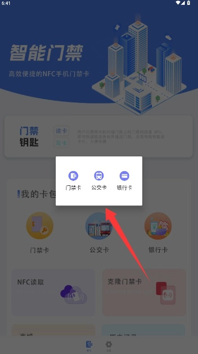 根据实际需求挑选门禁卡、交通卡或者银行卡类型,进入与之对应的读取功能操作界面。